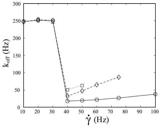 L-selectin tether dissociation rate as function of shear rate as determined from kinetic analysis of flow chamber experiments with white blood cells. Solid line with circles: wildtype. Dashed line with diamonds: tail-deleted mutant. Dotted line with squares: wildtype with increased viscosity of the medium. Our quantitative modelling aims at explaining the effective dissociation kinetics observed experimentally in terms of molecular processes at the cell-substrate interface. Schwarz and Alon, PNAS 2004. Adhesive dynamics simulations. Using a Langevin-equation approach for a sphere covered with reaction patches and moving in hydrodynamic flow above a wall, we simulate how cells attach to and move on ligand-coated substrates under flow conditions. Korn and Schwarz, PRL 2006.